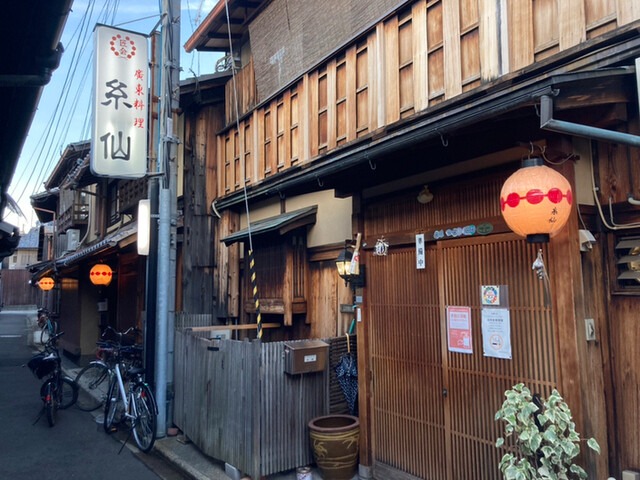 北野白梅町駅から徒歩10分ほど。京都・上七軒の石畳に馴染む「糸仙」は、町の風情を感じながら広東料理を楽しめる老舗の中華料理店です。