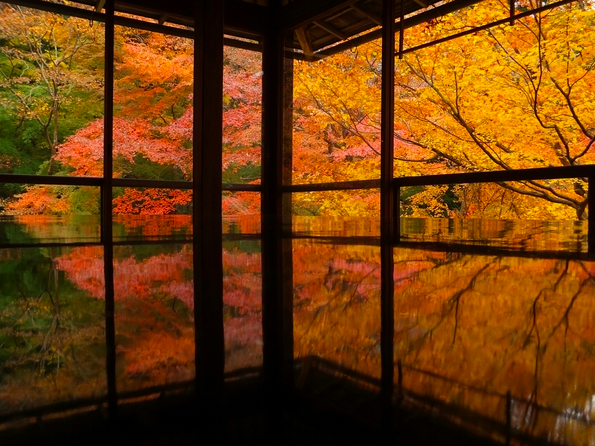 この寺院の特徴的な魅力は、2階の書院から見えるリフレクション効果。磨き上げられた机に映るもみじや庭園の景色が、訪れる人々に幻想的な体験を提供します!さらに、写経体験や庭園を眺めながらいただく抹茶も訪問者に好評で、静寂の中で自分と向き合う時間を楽しむことができます。
