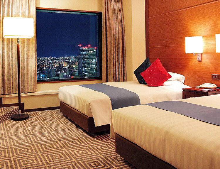 客室は、ニューロマンティックモダンをテーマにしたスタイリッシュなデザインが特徴。大きな窓からは中島公園の緑や夜景が望め、心安らぐ空間を提供します!シモンズ製のベッドや広々とした洗面台、細部に配慮されたアメニティが揃っているのも嬉しいポイント◎家族旅行に便利なコネクティングルームも用意されていますよ!