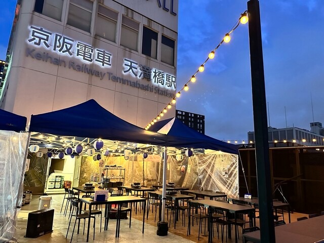 天満橋駅から徒歩1分。京阪シティモールの屋上にある「牡蠣肉酒場 天 rooftop terrace」は、都会の真ん中にいながら開放的な空気を感じられるスポットです。屋上ならではの景色と夜風に包まれながら、手ぶらで気軽に本格BBQを楽しめるのが大きな魅力。