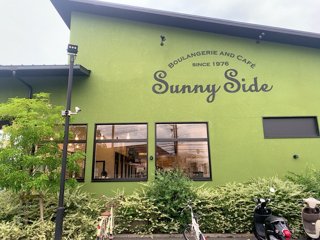 JR摂津富田駅からバスに乗り「今城塚古墳前」バス停で下車してすぐ。大阪府高槻市の今城塚古墳公園に隣接する「サニー サイド 高槻岡本店(Sunny Side)」は、緑の外観が印象的なベーカリーカフェです。