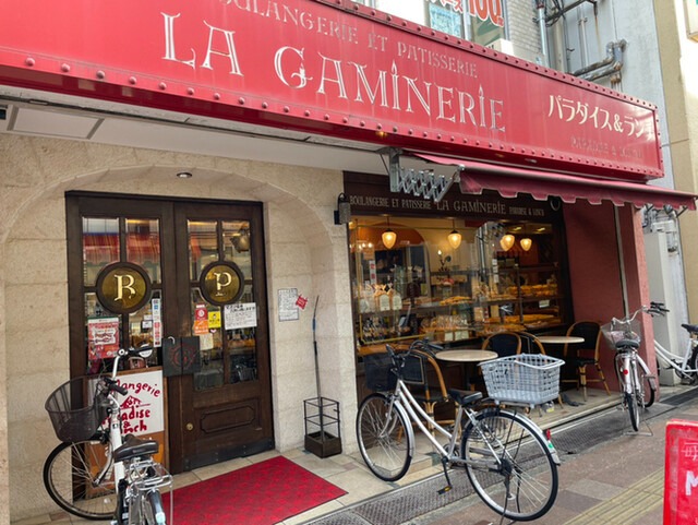 阪急高槻市駅から徒歩3分。高槻センター街の一角にある「ラ・ギャミヌリィ(LA GAMINERIE)」は、赤いテントが目印のパン専門店です。