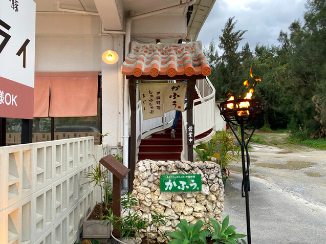 バス停「伊武部ビーチ前」から徒歩1分。沖縄県恩納村にある「かふぅ 名嘉真本店」は、沖縄らしい温もりを感じられる店構えと、本格的なあぐーしゃぶしゃぶが堪能できる料理店です。