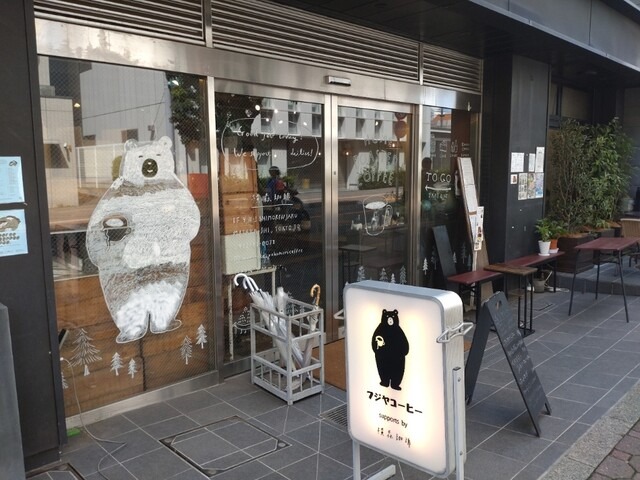 三鷹駅南口から徒歩8分。「フジヤコーヒー supports by 横森珈琲」は、かつて地元で親しまれた横森珈琲の流れを受け継ぎながら、新しい形で営業を続けるカフェです。入口にはクマのイラストが描かれた看板が掲げられ、ガラス張りの外観からは店内の温かな雰囲気が伝わってきます。