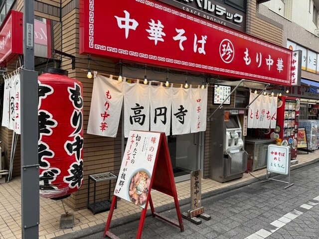 JR高円寺駅北口から徒歩3分。純情商店街の一角にある「ともちんラーメン」は、赤い看板と白い暖簾が目印のラーメン店です。