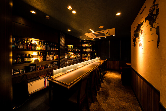 店内は照明を落としたシックな空間で、青と黒を基調にしたインテリアが印象的。カウンター席のほか、ソファを備えたボックス席も用意されており、少人数のデートから10名以上の貸切パーティーまで対応可能です◎店内は全席喫煙可で、静かなジャズが流れる落ち着いた雰囲気の中で、お酒と会話を楽しむことができます。20歳未満の入店はできませんが、大人だけの時間を過ごすには最適な場所ですよ!