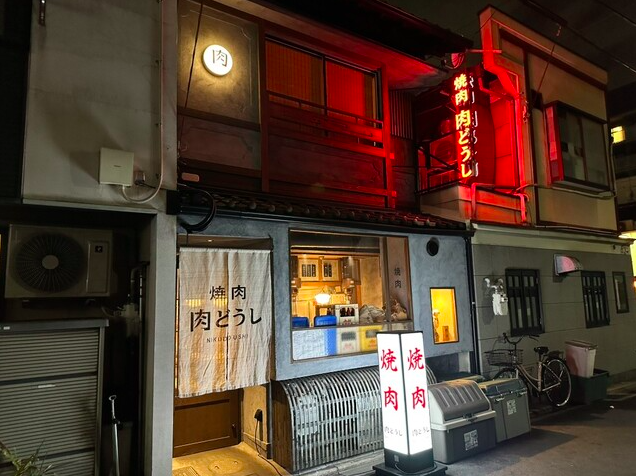 阪急京都線「西院駅」から徒歩3分。京都府京都市にある「焼肉 肉どうし 京都西院店」は、京都らしい落ち着きのある雰囲気を大切にしながらも、赤いネオンが印象的な外観と、夜遅くまで営業している気軽さが同居している人気焼肉店です。